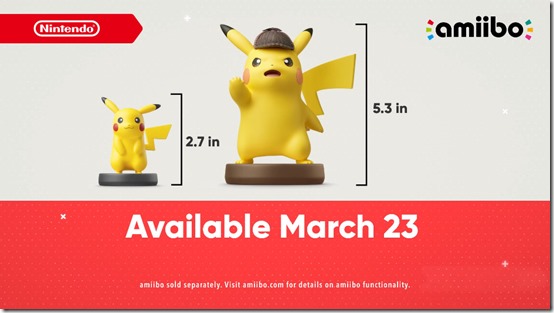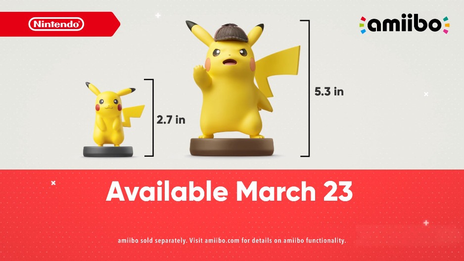 Detective Pikachu launches for Nintendo 3DS on March 23, 2018. The extra large Detective Pikachu amiibo figure also releases on the same date.