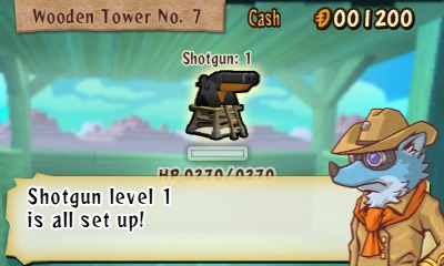 Dillon can also hire allies to help him protect the towns from Grocks. The three available are Gallo, a lizard, Boone, a bear, and Nomad, a squid. You can pay to recruit them, and these allies will then help Dillon gather materials during preparation periods and will take part in attacks at night. All of them wield guns, but also have some physical attacks. Nomad, for example, also tosses knives and bombs. Dillon can rely on them to attack on their own, or if you’re nearby a player can team up with them in a battle. Once an area is completed, they can be fought in a duel to permanently add them to the troop. Having allies really helped, because I always felt rushed when playing Dillon’s Rolling Western: The Last Ranger. You get a limited amount of time to prepare, but don’t have a timer. Which means you just have to dash around screen and hope you get every scruffle and mineral, not to mention reach towers to upgrade them, before night falls. When an attack is on, the Grocks don’t pause when Dillon is in a fight with a group, they keep marching forward. You don’t know how long a wave will last. Every second has to count. Even then, allies and towers only help so much, as both can easily be destroyed if Dillon isn’t there to help with support. Time isn’t the only issue. Money is as well. Everything is very expensive, and I was usually only able to build/repair and arm one tower at a time. There are sidequests that can be taken every night and completed within a certain amount of time, but if I wasn’t quick about completing them, I’d be penalized and lose money. You also have to pay to recruit allies and to replace Dillon’s equipment as it wears out. It is like difficulty overload. At the very least, I wished the game wouldn’t take money away from players if they couldn’t complete a sidequest in time. Or perhaps it could have removed the durability aspect of equipment instead. Give people an edge, because I really felt like I needed one. Ultimately, Dillon’s Rolling Western: The Last Ranger is easily the most difficult tower defense game I’ve ever played. I enjoy it and love the characters and setting, but I wish it were a bit more lenient. I appreciate a challenge, but the game started to feel like work. I never had the opportunity to relax and enjoy myself, because there was always some invisible deadline I had to meet so I wouldn’t fail. I would still recommend it to anyone with a 3DS, but people should know what they’re getting into. Dillon’s position as a ranger is tough, unforgiving work, and you have to make sure you’re smart and strong enough to succeed. Food for Thought 1. I wish there had been more thought put into StreetPass. As is, you can compare strategies with people you pass to see how they handled situations. I would have preferred some means to earn extra money or get extra equipment instead. 2. If you fail a level, you can restart with a little more money than you had the first time around. (Which makes me wonder why Russ couldn’t just give me the extra 1,000 to start!) 3. Nomad is the coolest new character. Who wouldn’t love a squid assassin wielding multiple guns? However, I do wonder how he manages to survive in the desert.