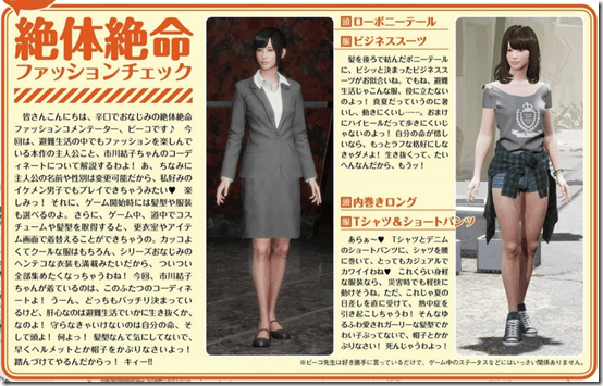 Finally, Famitsu also showed off how players can customize the protagonist with a variety of outfits. The outfits and hairstyles can be found while playing through the game, and can be customized in the item screen, or at changing rooms. Outfits can range to the fashionable to the silly. In Japan, there will be various costumes that are pre-order specific depending on which place you pre-order the game at. Disaster Report 4 Plus: Summer Memories will come to the PlayStation 4 in Japan on October 25, 2018. If you have a Japanese PlayStation Store account, you will be able to download the demo in August 2018.