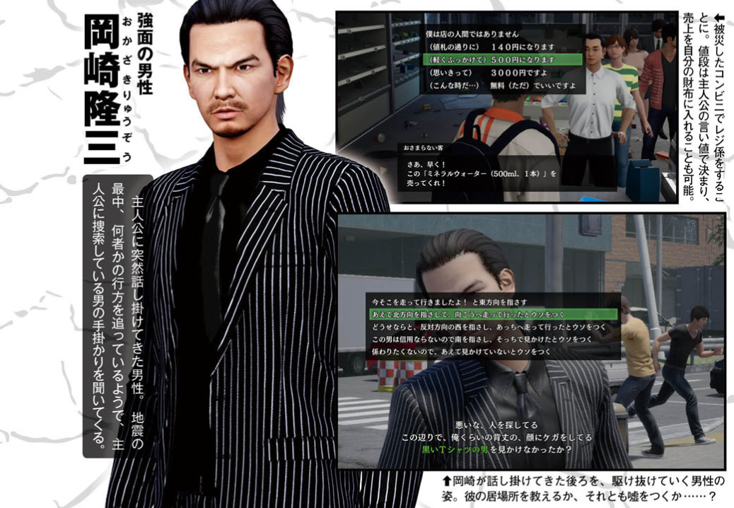 Ryuzo Okazaki suddenly stops the protagonist in their tracks, and asks about a man wearing a black T-shirt. It seems that he’s chasing after the person, and is looking for clues as to where he’s gone. Little does he know that the man he’s looking for can be seen right behind him as he approaches the player. However, whether the protagonist gives away the mysterious man’s location is up to the player. Yayoi Kasahara