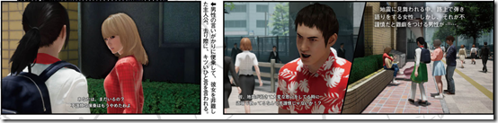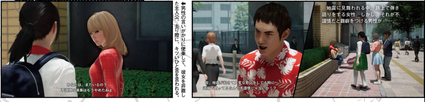 A certain sub-plot in the game was also shown off in Famitsu. Here, after the disaster strikes, a woman in a red shirt is seen playing the guitar, but she’s approached by a man who scolds her for doing such a thing at such an inappropriate time. You can choose to join in with the man, but this only makes her dislike you.