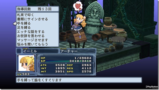 Dengeki PlayStation also gave us a look at the so-called "punishment" system in Disgaea 4. There weren’t any details, just this screenshot of an archer with her hands tied. Other commands on the menu include tie legs, dirty talk, and to give her a massage. While these commands are reminiscent of Criminal Girls, Disgaea 4 also gives players an option to listen to Ymir.