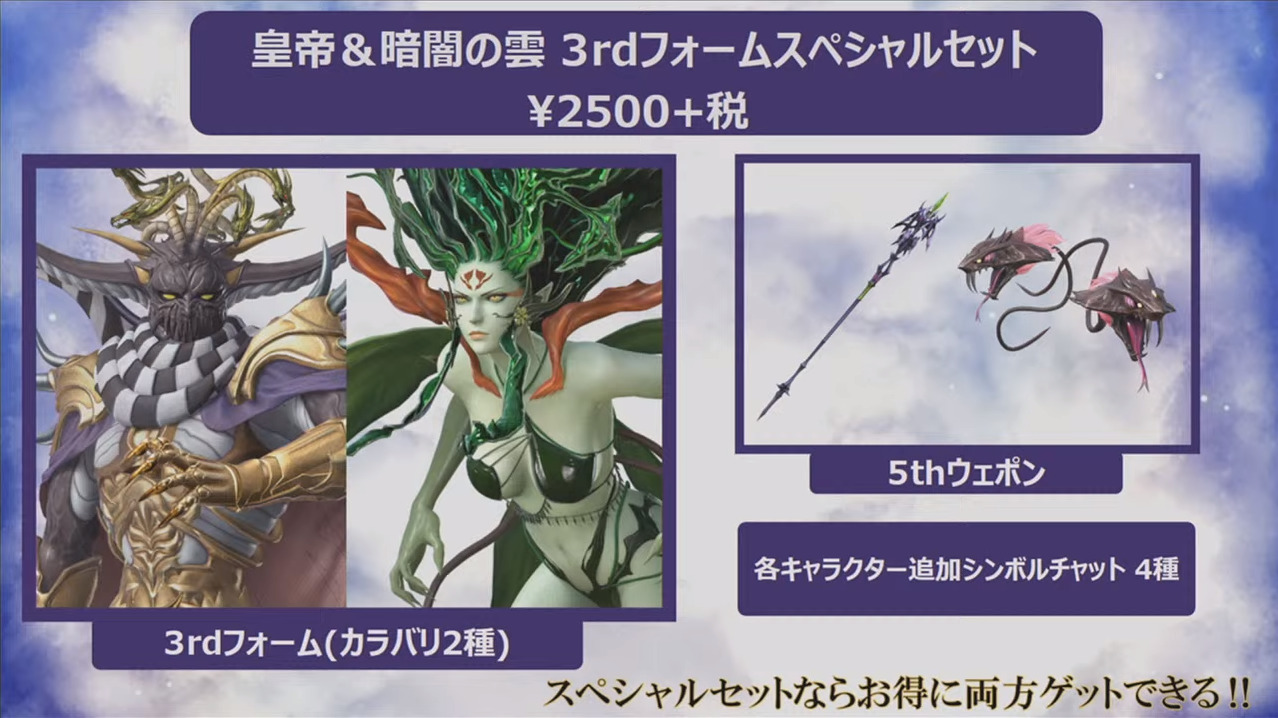 Cloud of Darkness’ 3rd Form + 5th Weapon set will also go for 1,500 yen plus tax.