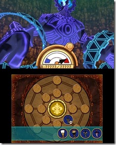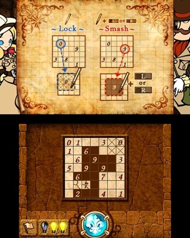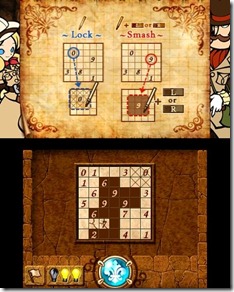 Congratulations! Doctor Lautrec and Sophie are now Underground. Which means it is now time for the one thing gamers love most in the world – block pushing. This isn’t just any kind of block pushing. This is block pushing in a labyrinth filled with cops that will chase you on sight, causing you to restart the room if caught with all blocks in their original places. Fortunately, you can press and hold B while moving the circle pad to see the rest of the room and watch guard’s patrol patterns. Still, Doctor Lautrec takes a while to move those blocks and sometimes those policemen or knights can sneak up on you. The next thing you know, Lautrec is caught, you’re at the entrance where you came in and you have to move all of the blocks all over again. I hope you enjoyed that, because you’re going to have to do this multiple times in each dungeon. Usually at least three, maybe four times. Eventually, you’ll run across a room with a fleur-de-lis on the door. This means it’s time for a puzzle. They’re all pretty much the same. You’ll either have to complete a pseudo crossword puzzle, where you place the right French words in the right places, spot difference, where you have to pick out a a few differences between a picture on the top screen and the bottom screen, a jigsaw-ish puzzle where you rearrange pieces to fill an empty space, a Minesweeper clone and sequence spotting, where you see a pattern on the top screen with one image omitted and you pick the one that’s missing. As much as I hate sequence puzzles, I have since ACT/SAT testing, the spot-the-difference ones are far worse. There was one spot-the-difference puzzle in an early side quest where a picture of a museum was blocking the main Treasure Animatus’ room. It took me 8 tries to complete it because, as far as I could see, there was no difference. What made it more difficult was that the image was of a brown-beige-sepia museum set against an eggshell white background and the bottom image in all spot-the-difference puzzles is slightly washed-out. I resorted to using hints over and over, then just guessing by tapping the bottom screen. On the final try I got lucky, and I’m still not sure what the difference was. I think there might have been a cream-colored cloud in the eggshell sky, but by that point I didn’t care. Which leads us to the taming/exterminating. Each dungeon has multiple Treasure Animatus inside, with a few being optional and one mandatory. Well, the optional ones aren’t really optional since you will need them to beat the main Treasure Animatus. You only get to take three tamed Treasure Animatus in with you and they likely won’t be strong enough on their own without living gems and newly tamed backups. When you enter the battle, you’ll see the Treasure Animatus in the center, surrounded by stone platforms that are either cracked or uncracked. You drag and drop your own treasures and gems onto these platforms. You drop one, it attacks, the enemy Treasure Animatus attacks. You repeat this until the enemy’s HP has dropped into the blue zone of a gauge, showing it’s tamed, or is completely gone, showing it’s now just a normal piece of treasure. You can’t heal or reuse treasures in combat. All treasure are assigned experience points after the battle, allowing them to level up. Not that it matters much, as the side quests usually provide strong treasures that are at a higher level, making it easy to abandon level 1 treasures.