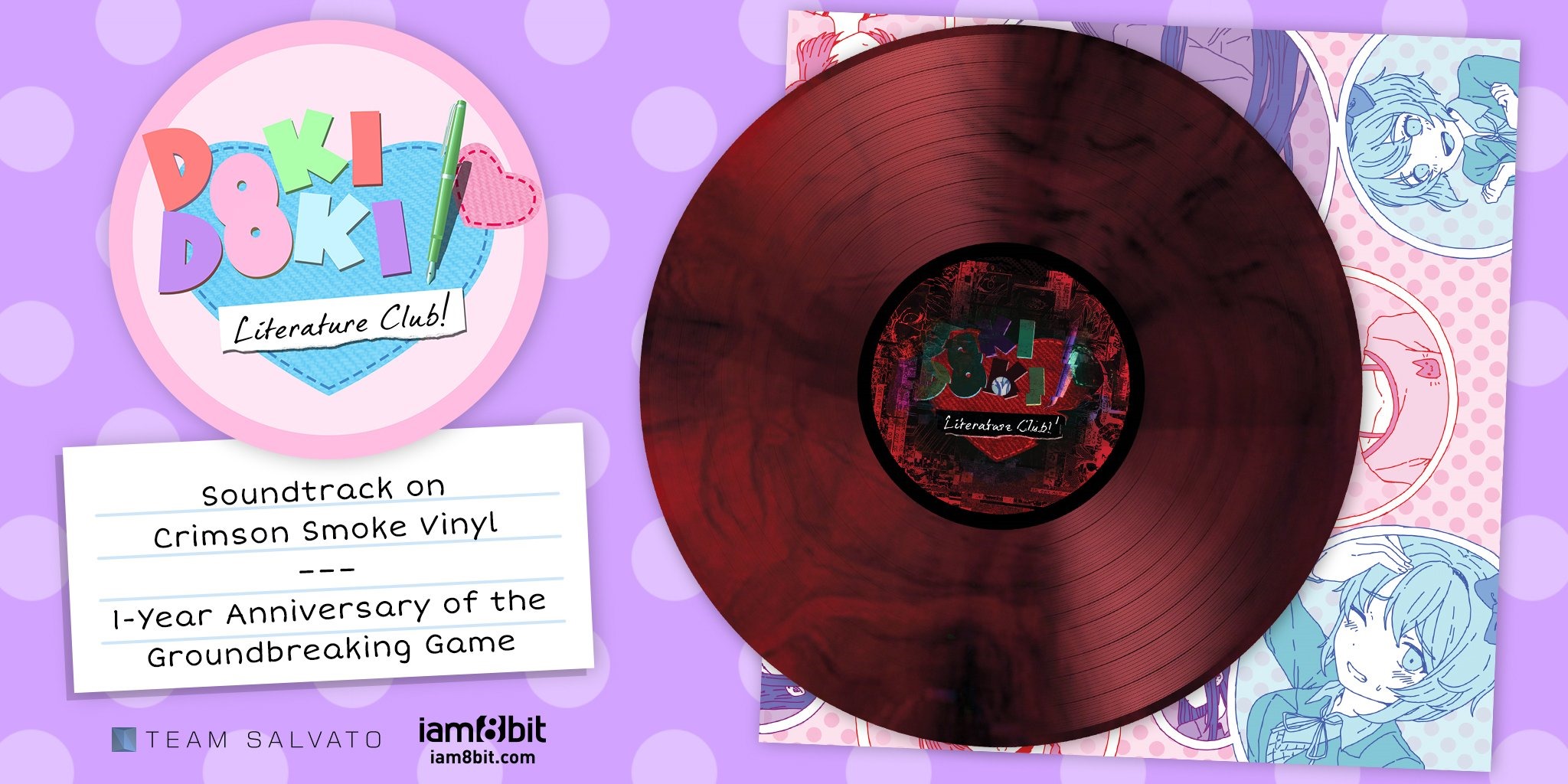A one year anniversary edition of the Doki Doki Literature Club soundtrack has been announced, and it has some unique features. This vinyl, which costs $28 at iam8bit and will be released in the first quarter of 2018, has art that lets you change who appears on the laptop screen on the cover. I am seeing Natsuki, Sayori, and Yuri, but no Monika.