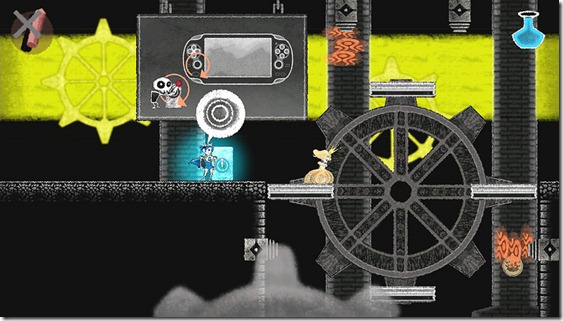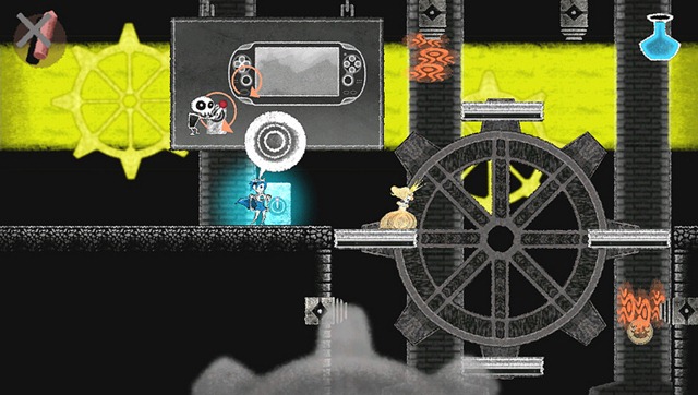 After a stage or two of dealing with enemies, I was given a piece of chalk. Given the chalky art style, I expected godlike power. Each swipe of my finger would draw a line of chalk on the screen, depleting some of my chalk gauge… but I could only connect broken ropes to boxes directly under them to get them out of the princess’s way. Fortunately, the next mechanic I was presented was far more interesting. I found a potion on the ground, and with a double-tap on the screen, the hero would drink it and transform from skeleton to prince (eliciting a humorous happy response from the princess). As a prince, I could actually kill enemies with two hits from a sword and pick up the princess to carry her down stairs and put her onto platforms (all of these actions are mapped to circle). Like the skeleton, the prince would take two hits before dying, losing his crown on the first hit. The prince has two limitations. First of all, the potion only lasts for a little while, draining as long as you’re in the prince form. On top of that, the prince can only jump about half as high as the skeleton (and even less when he’s carrying he princess), so to get through a stage, you’ll have to swap between prince and skeleton to get around. For instance, you might carry the princess down a flight of stairs onto a moving platform, then double-tap the back of the Vita to become the skeleton to jump up to a lever and lift the princess up. You then switch back to the prince to fight off enemies and clear the way to the flower. My demo concluded with a boss fight. At first, it was just the large boss in a tiny room, so I turned into the prince and started hacking away at the boss. This didn’t do a lot of damage, but it got the boss hopping around, so I switched back to the skeleton and used his giant jumps to dodge. Before long, two boxes fell from holes in the ceiling, one with spikes and one without. While the spikeless box was little more than an extra bit of height to grab a collectable trinket at the top of the screen, given the hoppiness of the boss I was fighting, I was able to use the spiked box as a weapon. Naturally, as the boss leapt into the air, I just grabbed onto the box and pushed or pulled the box into the right place for him to fall onto it. After he hurt himself on the spikes and destroyed the box, I had a bit of time to rush him as the prince and deal some damage to him with my sword. After repeating this process a few times, the boss was finally defeated. Dokuro will be released for the PlayStation Vita as a download game in October.