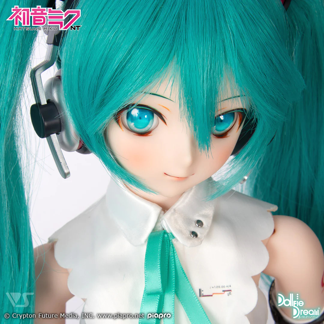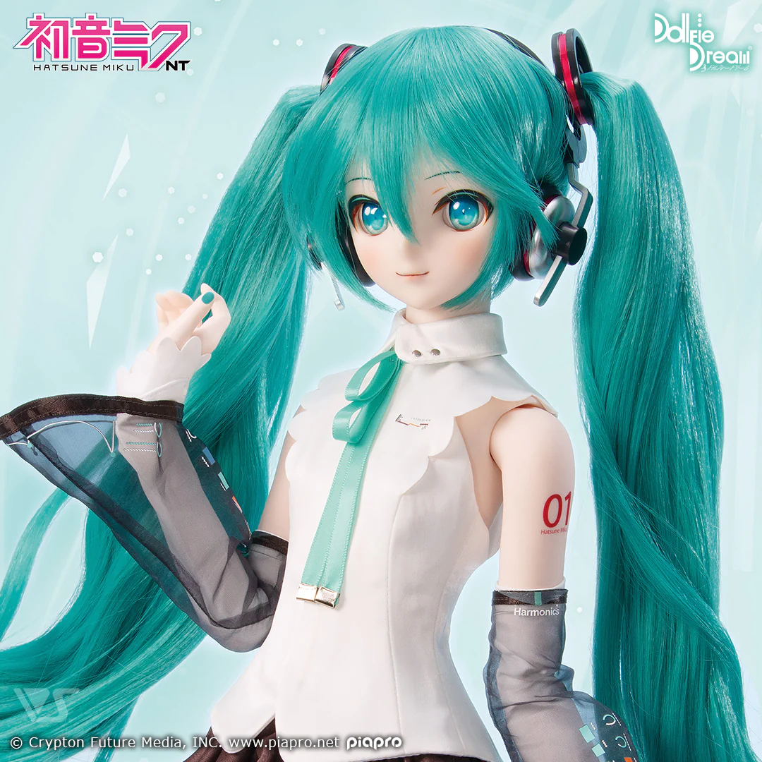The Hatsune Miku NT doll is built on a special model of the DD Base Body, featuring an “01” mark painted on the left upper arm. It also comes with an Original Style wig styled in Miku’s iconic turquoise pigtails. The doll comes with a set of clothes that includes optional arm covers, and comes with a second set of hands giving a peace sign. Other accessories include two hair accessories, a headset and a ribbon tie.