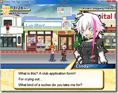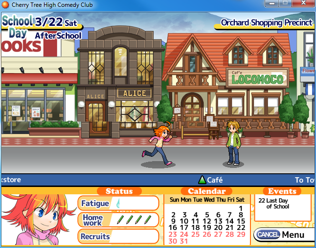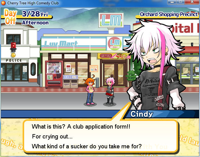 Miley Verisse, a comedy fanatic, decides to start a comedy club at her school. Unfortunately, the rules mandate that you need five members to get a club started, and Miley has until the end of Spring break to recruit more members. Cherry Tree High Comedy Club takes place in Cherry Town, and your job is to go around making friends and recruiting members for the comedy club.