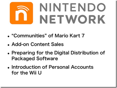 Nintendo have set up a new online network, dubbed the “Nintendo Network”. The Nintendo Network will be used by both the Nintendo 3DS as well as the upcoming Wii U console. Mario Kart 7 already uses the Nintendo Network for its “Community” feature, where players can gather together in large groups by sharing community codes. Speaking to investors during a financial results briefing, Nintendo president, Satoru Iwata, announced that in addition to downloadable content, one of the other planned uses for the Nintendo Network is to release download versions of packaged games, similar to Xbox Live and PlayStation Network. Nintendo haven’t decided just when they’ll begin offering download versions of retail games, but they say that the functionality for this is already built into the Nintendo 3DS and that the necessary infrastructure is in place. The same infrastructure is being prepared for the Wii U as well. Iwata emphasized that a decision regarding when to begin offering downloadable retail titles will be made after taking into consideration relationships with retailers and wholesalers, as well as the market and consumers.
