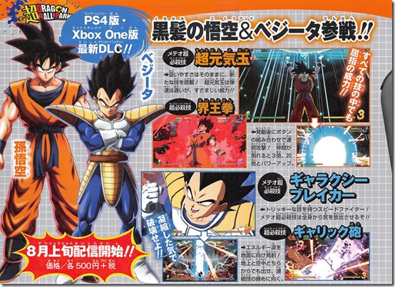 Base Goku and Base Vegeta will be available for 500 yen each via DLC in early August. Additionally, an open beta test for the Switch version will start in August with a 3v3 local battle feature.
