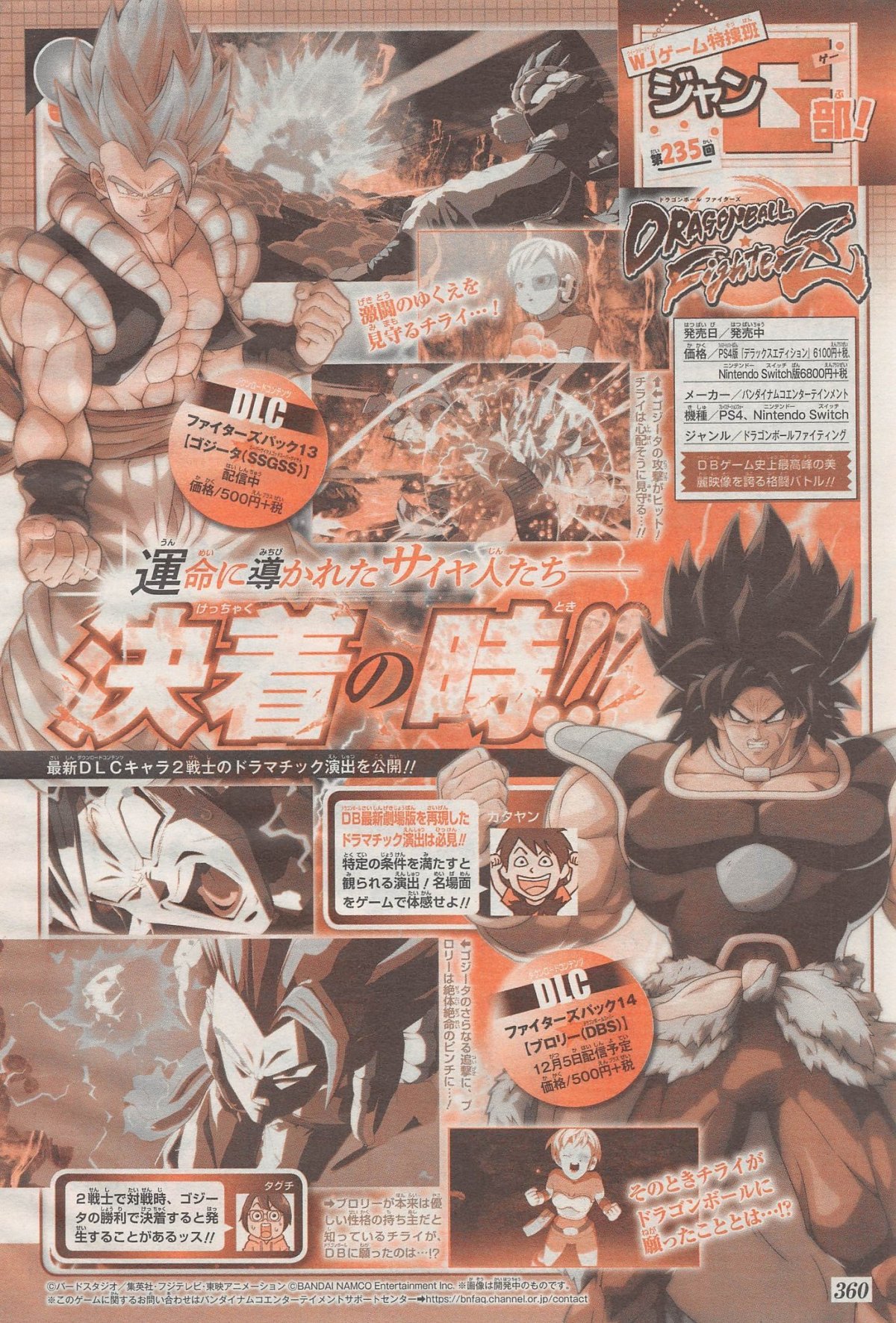 Dragon Ball FighterZ gets its next DLC character with Broly (DBS) on December 5, 2019 according to the latest Jump. Broly comes with the Characters Pack 14 for 500 yen in Japan. [Thanks, Ryokutya2089.] Update: Scan added via ShonenGames.