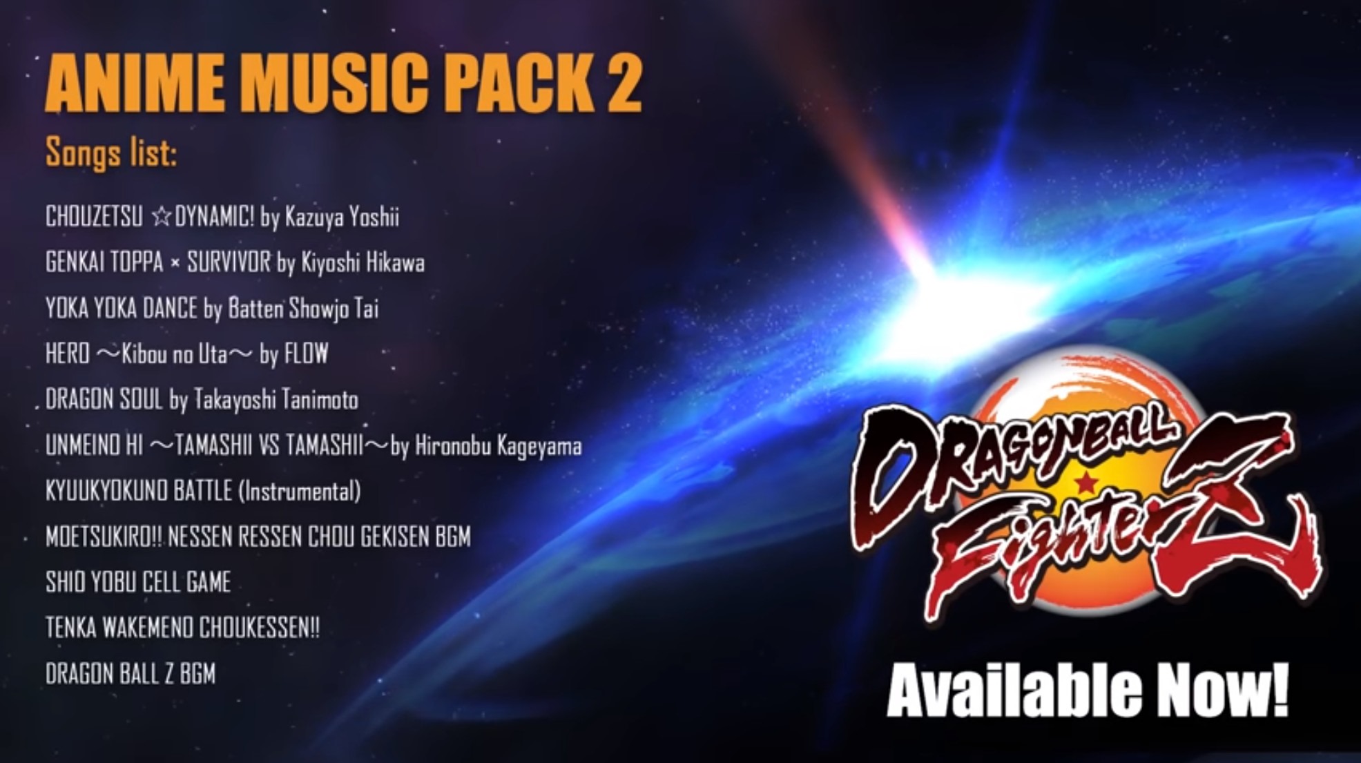 Both Dragon Ball FighterZ and Dragon Ball Xenoverse 2 are getting a new pack of anime songs from Dragon Ball Z, Dragon Ball Z Kai, and Dragon Ball with the Anime Song Pack 2. Here’s the song list for the Anime Song Pack 2: