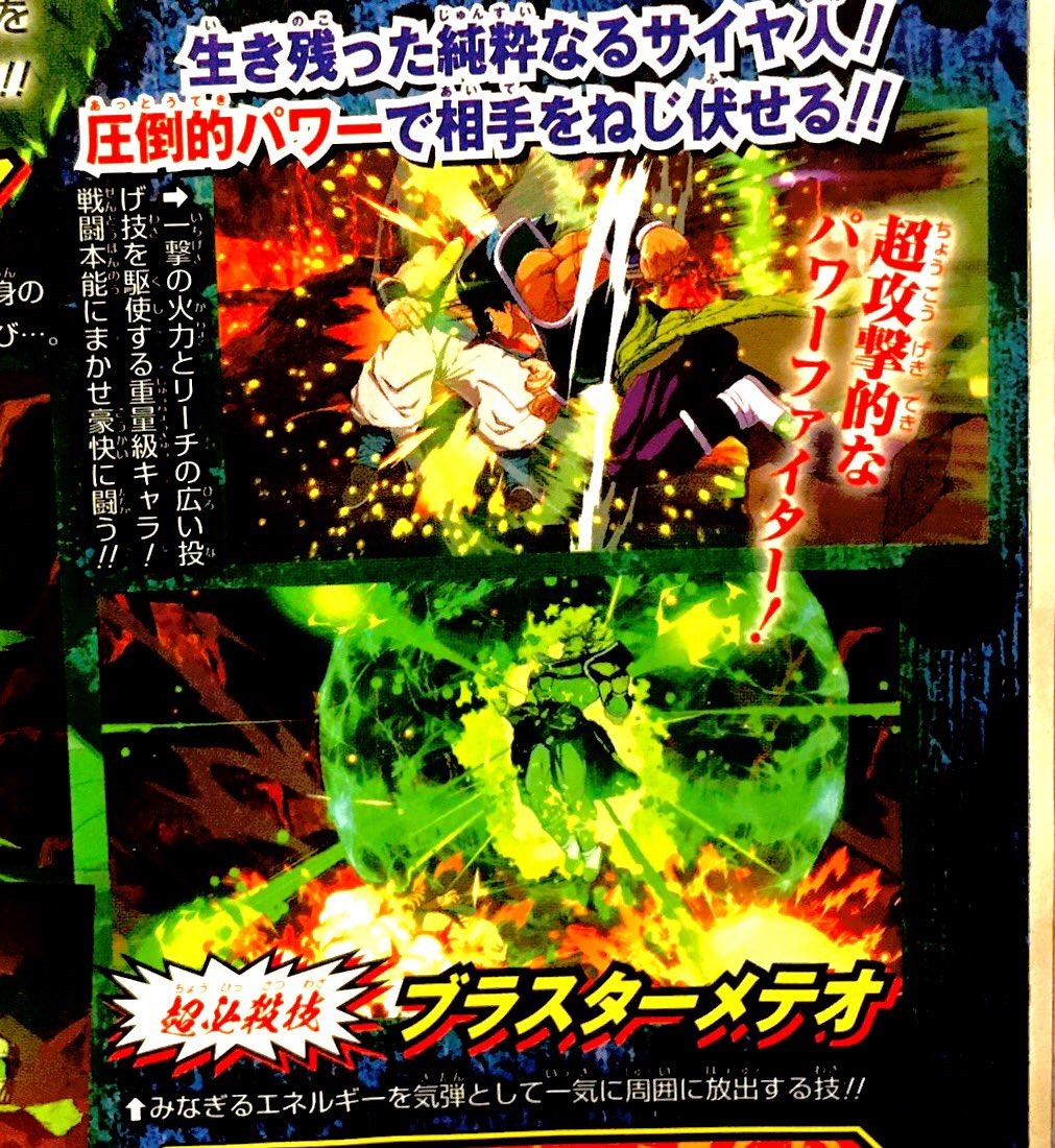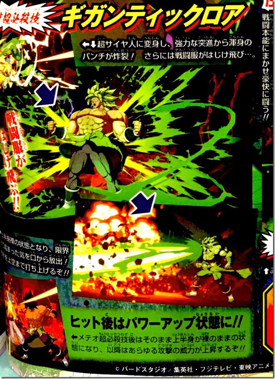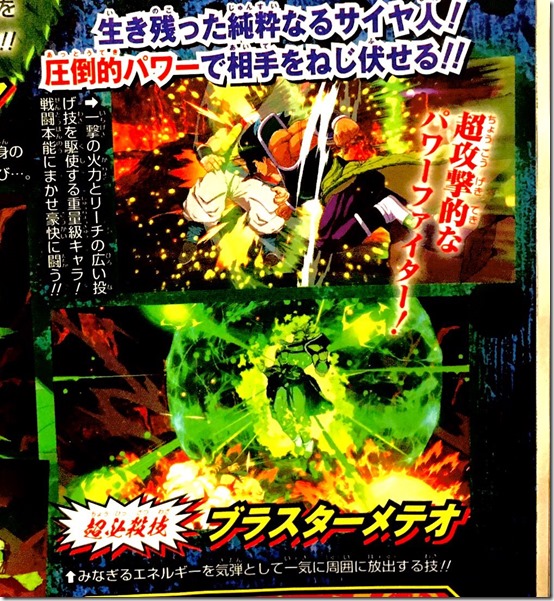 Broly (DBS) is described as a heavy character that packs a tremendous punch to go with long reach. The above scan shows him using his “Blaster Meteor” Super Special Attack on the bottom.