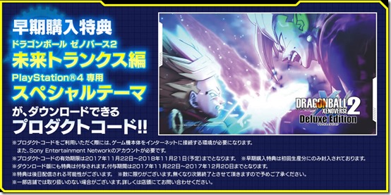 4573173322539   Bandai Namco announced that Japan is getting Dragon Ball Xenoverse 2 Deluxe Edition, featuring the full game and all its Season Pass DLCs at a cheaper price for PS4 in Japan this November.   2017-10-03_024107 The Deluxe Edition features the full Dragon Ball Xenoverse 2 game on PS4, which normally costs 8,208 yen plus the 2,500 yen Season Pass with all DLC all for a lower price of 6,588 yen. 2017-10-03_024023 With all DLC characters, the game features a total of 96 playable characters.   img_benefit The game’s first-print bonus comes with a product code for a Future Trunks Saga PS4 theme.   Dragon Ball Xenoverse 2 is available on Ps4, Xbox One, Nintendo Switch, and PC. The Deluxe Edition releases in Japan on November 22, 2017 for PlayStation 4.