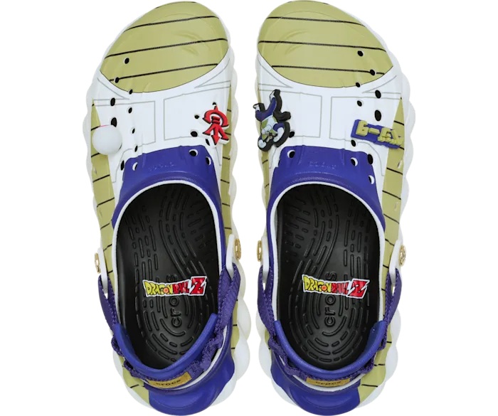 Meanwhile, the Vegeta Crocs model is inspired by Vegeta’s iconic blue and white Battle Armor. The adult sizes for the Vegeta Crocs cost $89.99/14,850 yen, while the kids’ sizes cost $64.99, with no kids’ models available in Japan. The exclusive Jibbitz charms for the Vegeta model include his Space Pod, Vegeta’s Great Ape form, and Vegeta’s name in Japanese. In addition, a set of 5 Jibbitz charms for Crocs will be available for $19.99/2,420 yen. The charms included feature Goku, Vegeta, Piccolo, Frieza and the 4-star Dragon Ball.