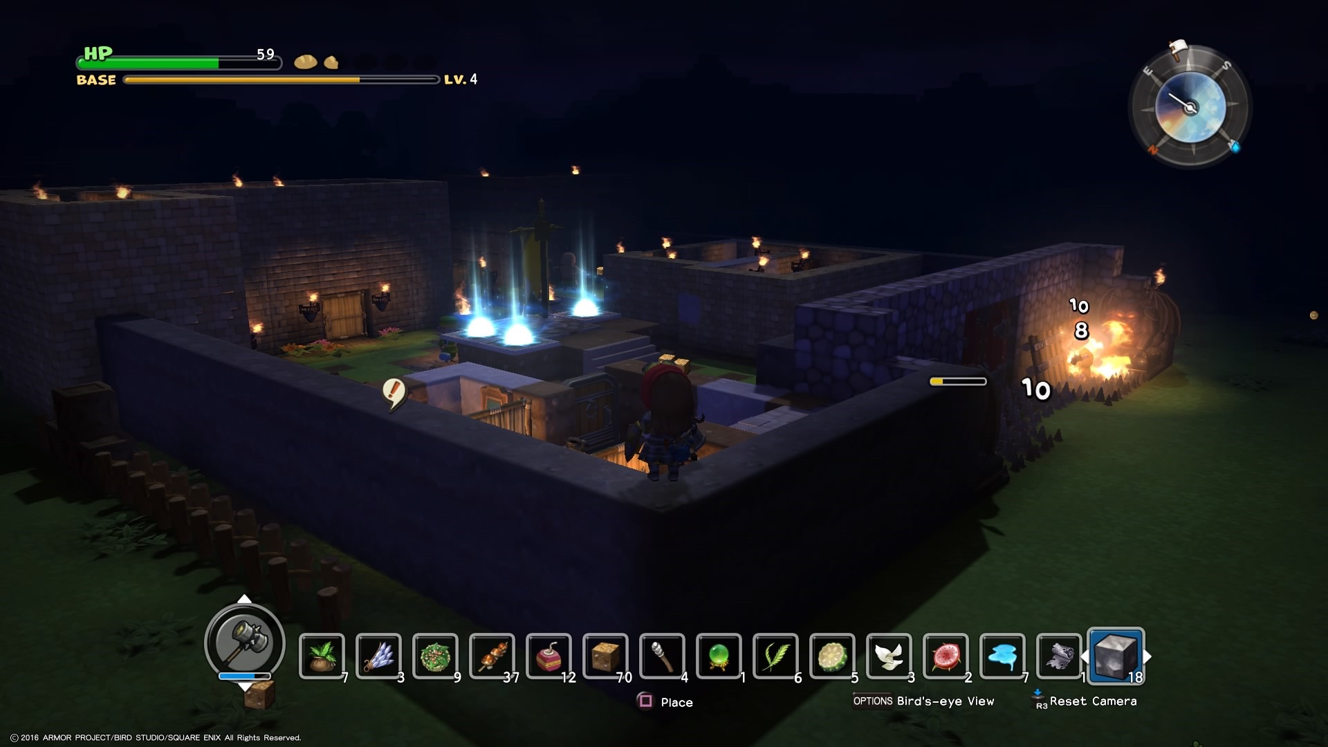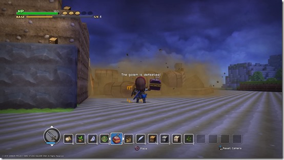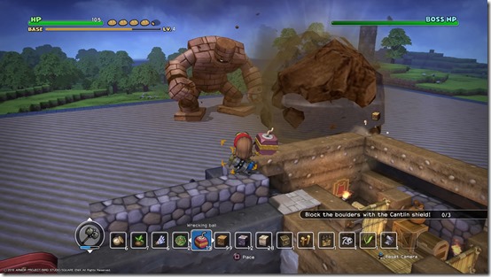 Here’s where it gets easy. As you can see in that Dragon Quest Builders screenshot above, the Golem’s boulder landed a direct hit on Cantlin’s new Obsidian wall. It shattered, and only did damage to one superficial earthen block I’d placed to keep Rollo from hopping up and out of the city during an earlier wave. His attacks will do no damage, which means no cleanup after the boss fight.