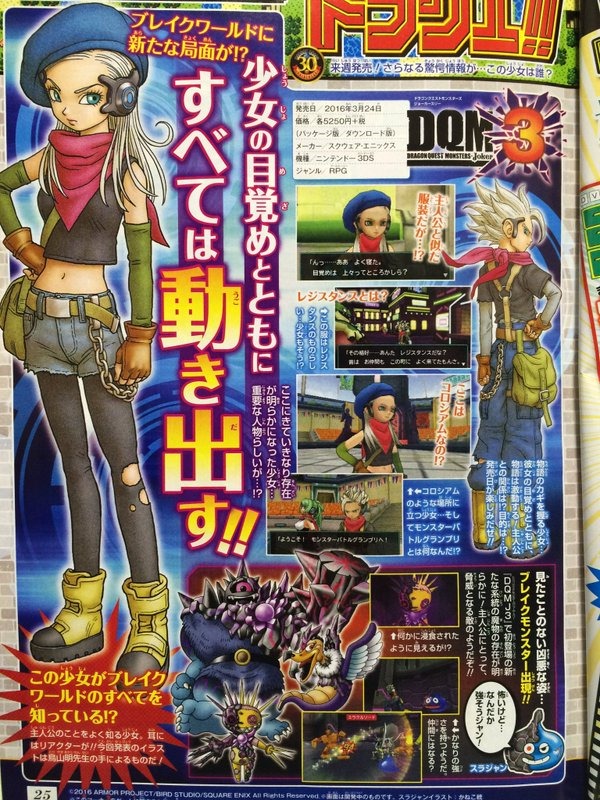 Square Enix revealed the latest on Dragon Quest Monsters Joker 3 with an interesting new character introduced in this week’s issue of Jump magazine. [Thanks, @Kazu4281.] Dragon Quest Monsters Joker 3 protagonist has no recollection of his past, so he’ll need to work his way around Break World to figure things out bits at a time. Things will surely get interesting when he meets this mysterious female character. As you may have noticed from her appearance, she’s dressed very similarly to the protagonist, and is also sporting a Reactor on her head. They say that their clothing is that of the “Resistance” but we don’t know much about this organization. In any case, she, too, is from Resistance, and knows a lot about the protagonist and basically everything about Break World. You’ll meet her in an area that looks like a coliseum, and they also mention something called the “Monster Grand Prix.” While much remains a mystery about her, including her name, she’ll play a key role in the story of the game, and maybe even in getting back the protagonist’s memories. The magazine also shows mysterious evil versions of monsters called “Break Monsters,” and they’re said to be super tough. Dragon Quest Monsters Joker 3 will release in Japan on March 24, 2016 for Nintendo 3DS. You can check our previous report for a look at the game’s latest trailer highlighting some of its main features, and it even shows us a glimpse of these new Break Monsters.