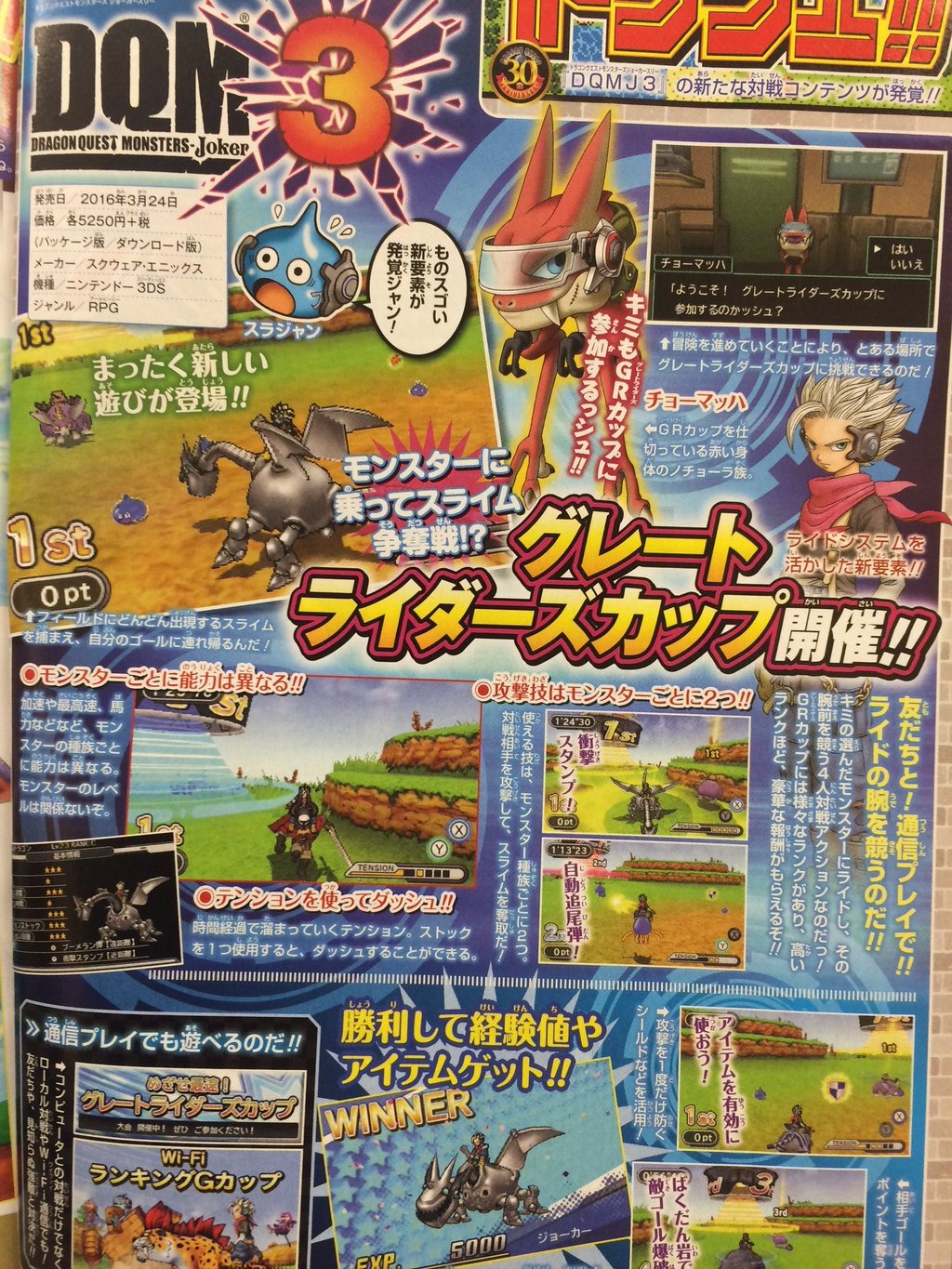 This week’s issue of Jump magazine shares the latest details on Dragon Quest Monsters Joker 3 with info on the new “Great Riders Cup” feature that will pit you up against friends for some nice rewards. [Thanks, @Kazu4281.] The “Great Riders Cup” is a new feature that uses the game’s “Ride System” and will have four players compete with each other while riding on monsters. In addition to playing against the AI, you’ll also get to connect with other players via local and Wi-Fi connectivity. In this mode, you score points by capturing Slimes on the field and taking them to the goal. The player with the most points wins the game. Again, there’s a ranking system with splendid rewards for those with higher ranks. Monster types have different acceleration, top speed, and horsepower. They’ll also have two of their own attacks. There’s a tension meter that builds up over time that will let you dash, and there are items such as shields for defending yourself from attacks and bombs. Dragon Quest Monsters Joker 3 will release in Japan on March 24, 2016 for Nintendo 3DS.
