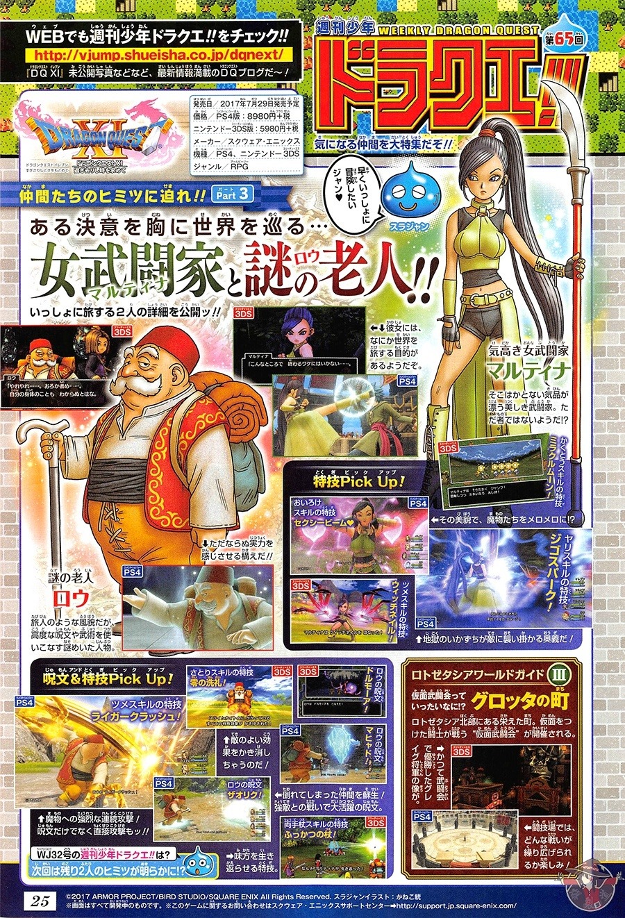 bcfcde0agy1fh23cxgpa7j20p010q4ou Square Enix shared new details on two Dragon Quest XI characters in this week’s issue of Jump magazine. Here’s the latest on the martial artist Martina and the mysterious old man named Row. [Thanks, @爆裂道.] Martina 2017-06-29_015236 Martina is a rather vague female martial artist who is traveling around the world for a certain purpose.   Here are some of her moves:
