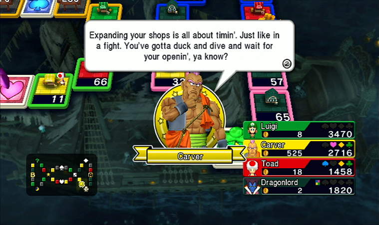 In Fortune Street the Dragonlord speak with "thous" and "thees." It’s a little nod to the original Dragon Quest (aka Dragon Warrior) and its olde English style localization. This crossover title brings characters from the entire Dragon Quest series and the Mario games into one Wii board game.