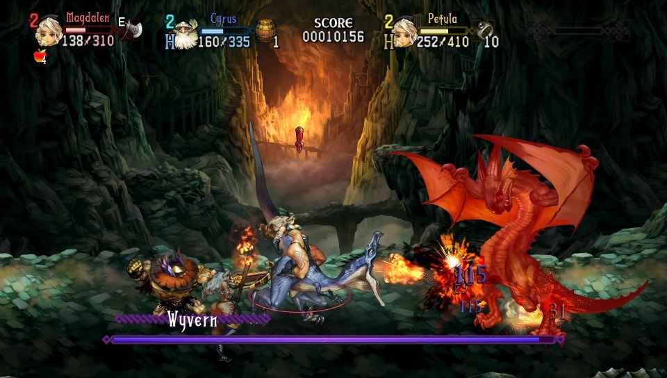 Before I knew it, I had crafted a Fighter that fit my attack-heavy playstyle and started tweaking the way I played to better match the abilities that I could upgrade. I funneled points into stronger attacks and the chance to auto-block attacks so I could basically constantly stay in harm’s way and survive, but I also began using the shield bash against enemies that outleveled or overwhelmed me so I could start a combo against them when they were stunned. This gradual evolution of my playstyle allowed me to survive against some of the later, tougher bosses when my AI compatriots were being less than helpful. On your travels, you’ll find the bones of various wanderers who have supposedly died mid-adventure. Pick them up and you can pay a small fee at the church to revive them when you get back to town. They’ll wait for you in the town bar and you can recruit them to go with you on their adventures. While this is handy at first, the further you play, the less helpful AI becomes. I basically only was able to beat the last boss on the standard difficulty because my teammates acted as distractions for it as I attacked, getting torn to shreds and hardly getting out of the way of the boss’s screen-spanning attacks. Add to that the fact that you have to reselect your teammates (and resurrect new ones) every time you return to town (whether it’s after a successful quest or a crushing defeat) and dealing with AI gets a bit tiring after a while. It’s easier just to select the option to have AI compatriots drop by in the middle of an adventure, even if that doesn’t necessarily let you build the party you want and might leave you in the lurch before a boss. Despite my complaints about the AI and my initial trepidation toward the Fighter, I had a great time with Dragon’s Crown. There’s a sense of storybook adventure to it that I haven’t seen in many other games. From the narrator who describes your adventure and will occasionally provide a few hints for your exploration or combat (shouldering the majority of the game’s voice work in the process), to the gorgeous backgrounds that are given a bit of history and personality through the various side quests’ flavor text, to the way that each stage has secrets that can be revealed and hidden paths that can be unlocked by “clicking” parts of the stage with the right analog stick or the touch screen, there’s something about the game that feels a lot more alive than most other 2D sidescrollers tend to feel.