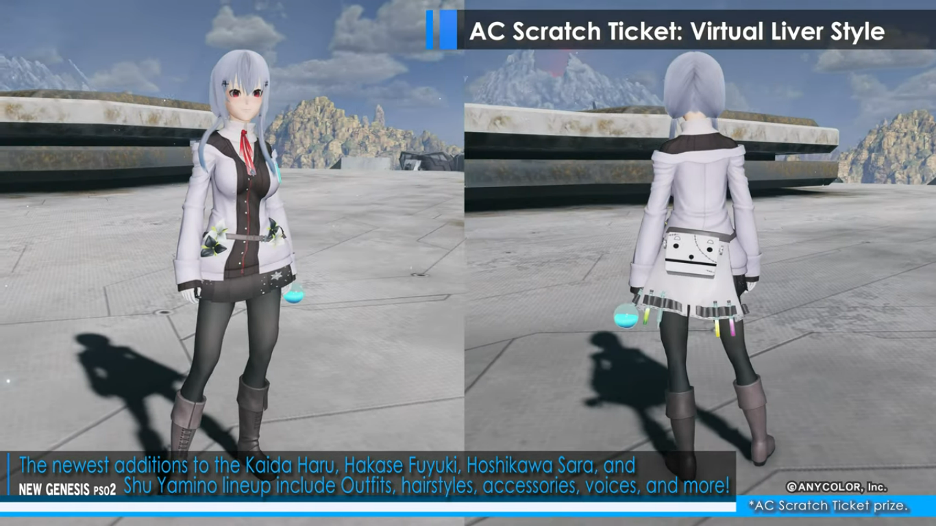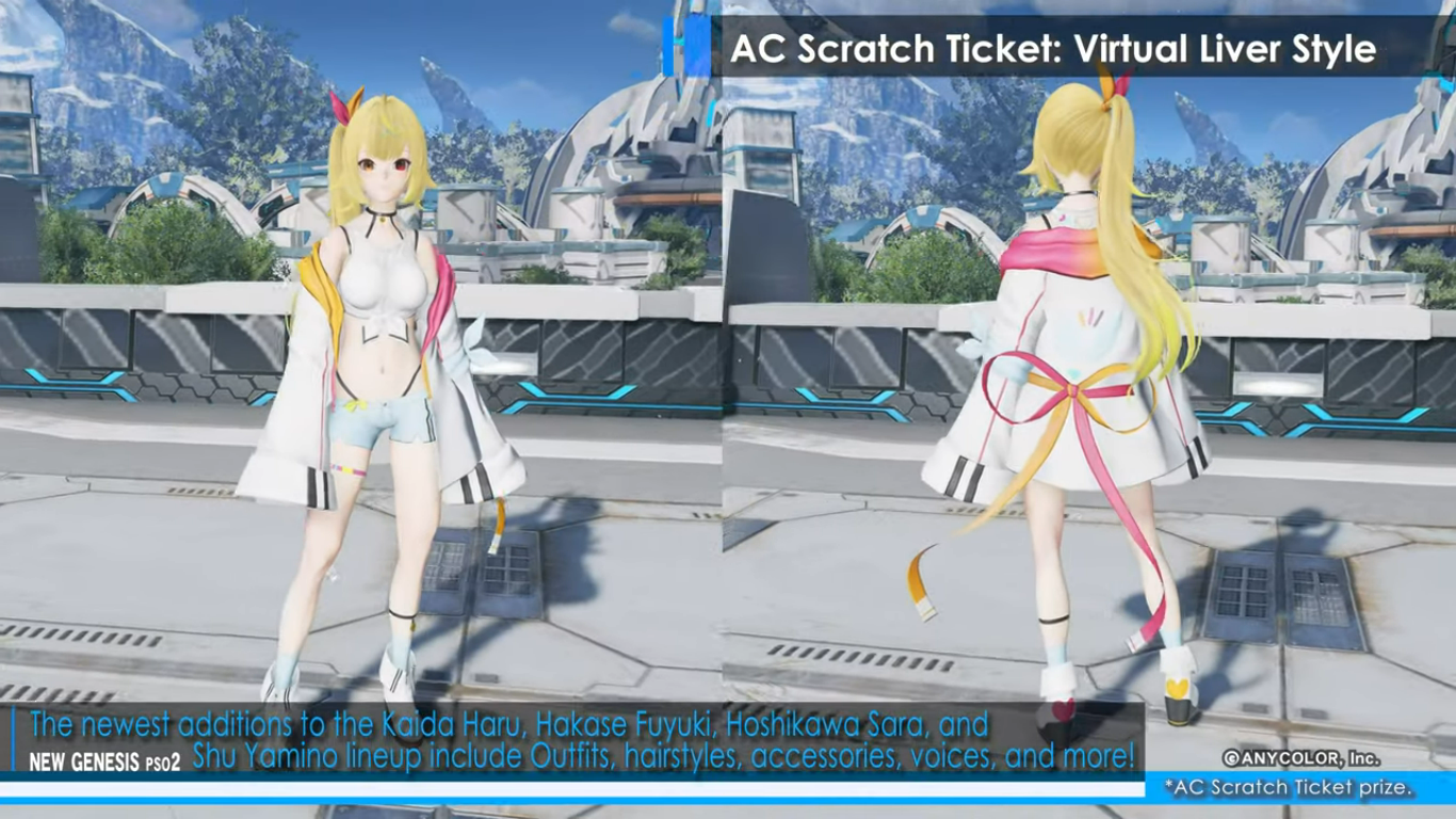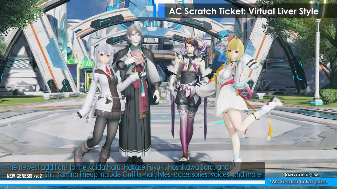 A new video shared by Sega brings more information about the new collaboration event featuring Nijisanji VTubers in Phantasy Star Online 2: New Genesis. The Virtual Liver collab will come with the next content update for PSO2: New Genesis in February 1, 2023. The game will be decorated with cutouts of Nijisanji members, and players will be able to obtain Nijisanji-themed equipment, accessories, hairstyles, and more. Phantasy Star Online 2: New Genesis is preparing to welcome some of the members of the Vtuber group company into its world. Life-size cutouts of Kaida Haru, Hakase Fuyuki, Hoshikawa Sara, and Shu Yamino will appear in Central City. Region Mags in the game will be decorated for the duration of the event, as well. As a login bonus, players can obtain stickers of logos and autographs of the Vtubers to decorate their equipment. The event also brings new AC Scratch Ticket rewards, under the “Virtual Liver Style” line. Again, new outfits, accessories, hairstyles, and voices inspired by Kaida Haru, Hakase Fuyuki, Hoshikawa Sara, and Shu Yamino will be distributed to players through AC Scratch Tickets, a lottery system in which players use ARKS Cash to obtain items and cosmetics. You can check out some of the items included as AC Scratch rewards below: