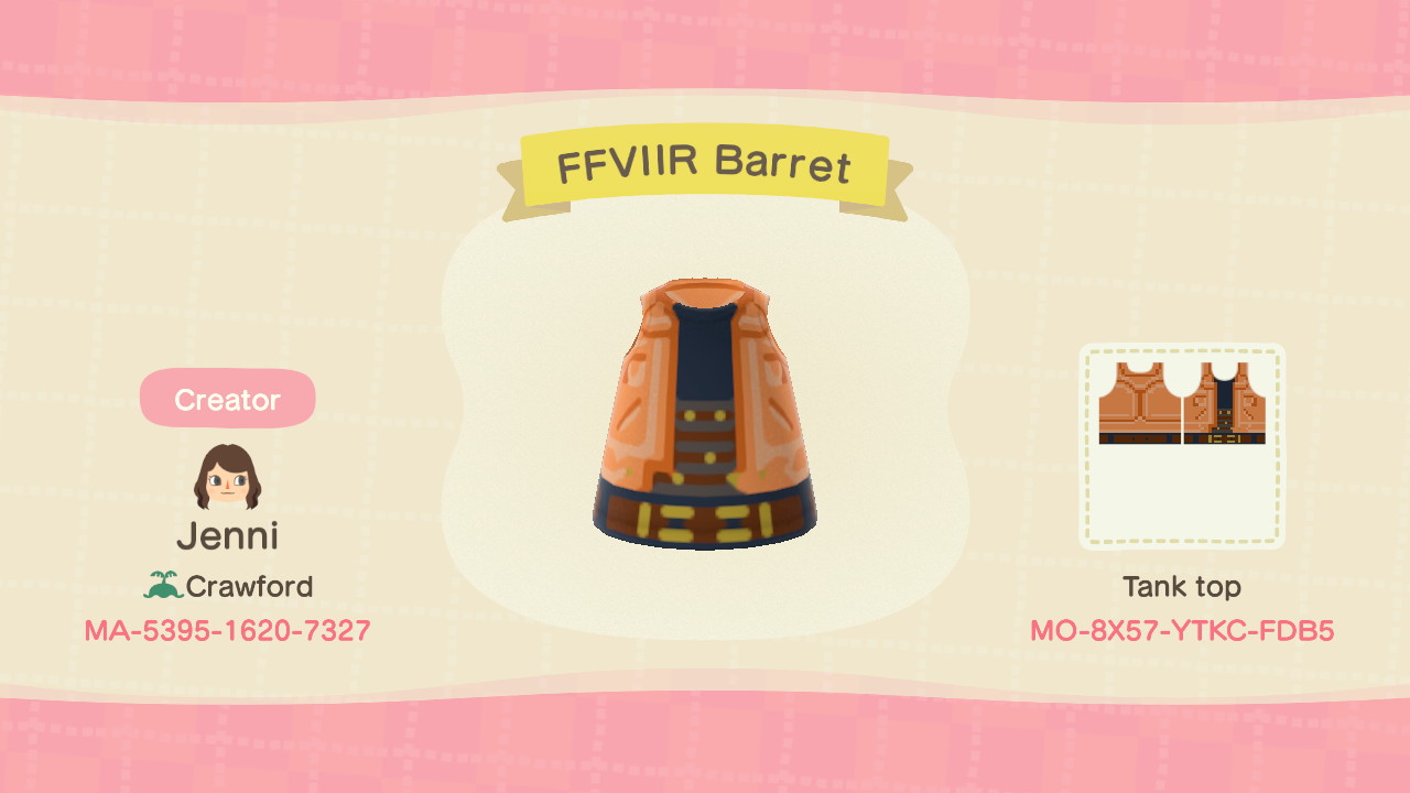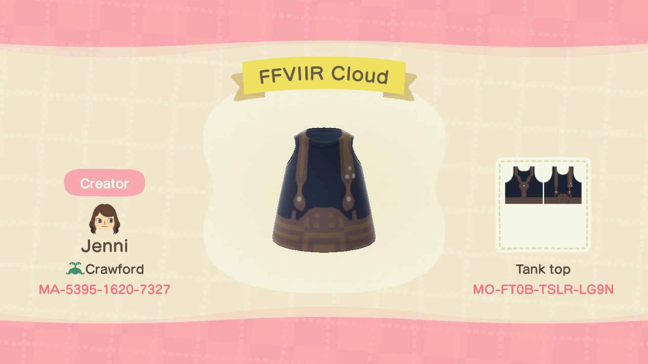 As a reminder, you must have an Able Sisters open in Animal Crossing: New Horizons to access these Animal Crossing Final Fantasy VII designs’ codes. There is a kiosk in the back of the store where you can enter creator or design codes to see different options. My creator code is MA-5395-1690-7327, where you can see all outfits. (That includes the Persona 5 cast clothing designs.)