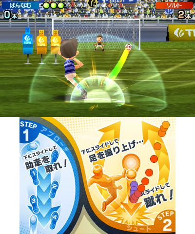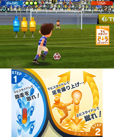 Soccer, one of the seven sports mini-games in DualPenSports, has players use one stylus to draw a line downwards on the blue area to move character’s foot back and flick the stylus forward to kick a goal. Baseball has similar controls you move the bat back with one pen and send hit the ball with a fast line forward. In both of these games, the angle you kick or hit the ball depends on the curve of your stylus flick.