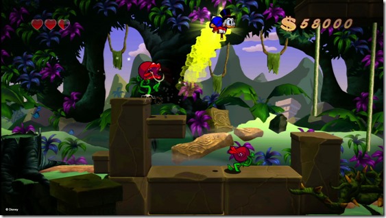 The Amazon also brings to the forefront another issue that some people had with their first taste of Ducktales Remastered, and that’s the control. Jumping, primarily with the pogo stick, and especially when dealing with the enemy, just felt off before, but here it felt even more awkward. The problem wasn’t as noticeable when at the castle, since the number of enemies was fairly limited on that end—plus their movement was on the slower side. But here, in The Amazon, you have those apes that move a fair bit faster on the ground, bees that come at you in the air at the most inopportune times, and piranha plants that are placed right where next to where you need to jump. The enemy placement largely resembles where they were before and it still makes total sense, but jumping on or around them is a bit of a pain. It’s especially worse when you have the part in which the ground is nothing but thorns, so one must pogo jump across and also avoid enemies. I figured my skills might be rusty, but I found myself dying over and over and over again. This was with the Xbox 360 controller, and I wondered if it might feel different on something else, like the Wii U’s GamePad, so I decided to give that a go.