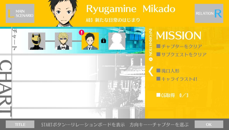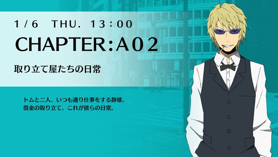 Durarara!! Relay is being developed by Kadokawa Games that has over 35 characters from the anime series with voice acting in it. The "Relay" system has players control a different character in the story each chapter. Durarara!! Relay keeps track of your relationships between characters with RP earned each time a bond deepens.