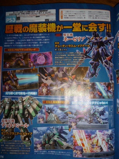 The above is a look at the two new mechas, with Nezeria on the top-right, which will be piloted by Tudy. According to the report, Nezeria is based on Ismile, and won’t have the ability to regenerate. The bottom-left of the scan shows the “super mecha” Duraxyll, and will be piloted by Senia, instead of her brother Feil-Lord Gran Bilseia who was the previous pilot back in Super Robot Taisen EX. In case you missed it, you can check out our earlier report to take a look at the two other new pilots and their mechas. Super Robot Taisen OG Saga: Masou Kishin F — Coffin of the End will be released in Japan for PlayStation 3 on August 28, 2014.