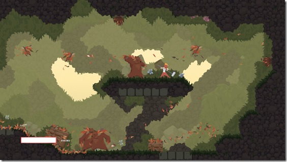 Interestingly, Dustforce uses its myriad of movement options in order to offer some exploration in the environments. This is most notable in the hub areas of the game, where you traverse five different environments in order to get to the actual levels. While many of the level entrances are right in your face, others require some elaborate jumps across the area to discover. These offer some unique opportunities to explore the game’s mechanics in interesting ways, and they were a surprisingly neat addition. Exploration isn’t really what the game is about though, at least not in terms of finding hidden routes. Your true path is already laid out in the form of dust trails; it’s up to you to clean it all up in the most efficient way possible. Using your acrobatic move set established, you must jump and sweep your way through elaborate platforming levels that are just waiting to murder you. After a few levels it quickly became apparent that Dustforce is a difficult game. Combined with the momentum-based nature of the game and some dastardly level design, being a janitor in this world requires nerves of steel. Enemies will assault you during your cleaning crusade, and initially they seem like total pace-killers. Not only can they take a ton of damage, but it’s easy for their attacks to knock you off course. Slowly I figured out that they all had certain tricks to them, and these battles actually became one of my favorite aspects of the game. Learning to fight all of these enemies efficiently is essential, as they factor into your final ranking. Dustforce judges you on two criteria: completion and finesse. Completion is scored by how thorough your cleaning job was, while finesse concerns how long you kept your cleaning streak up without pause. In order to get the best rankings (an S for each category, referred to as an SS rank) it’s almost required to do multiple playthroughs for each level. Since your paths are essentially pre-set by the dust trails, memorization and efficiency are huge parts in performing well.