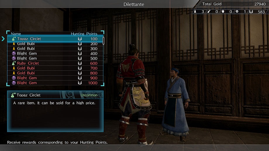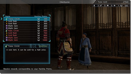Hunting Points are earned from hunting, and rewards such as coins and gems can be obtained from the Dilettante according to the Hunting Points earned.