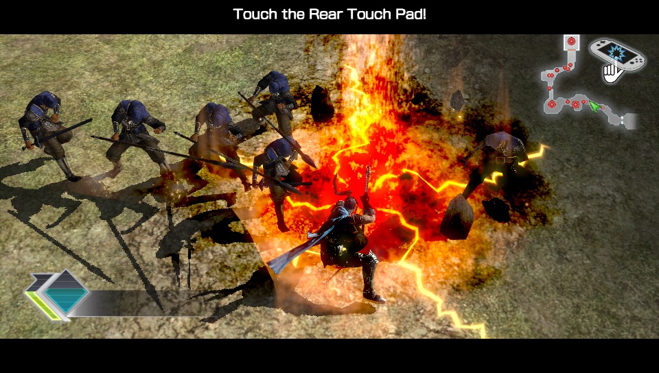 Trigger this attack to make Zhao Yun shove his spear into the ground. While Shadow Musou was active, I tapped the rear touch panel to make explosive magma sear enemies. I think the developers were playing with the idea that the rear touch panel was underground and that’s kind of thoughtful.