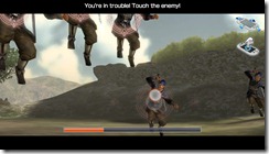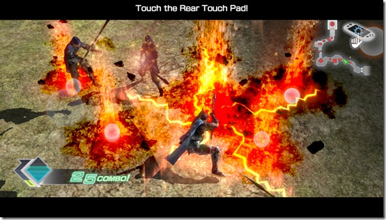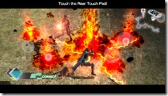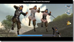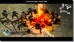 Dynasty Warriors for Vita has another touch screen attack. Tap the front screen and you can use a burst move to send enemies flying. This seems like its designed as a crowd control maneuver. Moving forward, I triggered a scripted ambush event. Three soldiers leapt in the air (in bullet time) and I had to tap them to attack. This part of the demo utilized the front touch screen and the Vita’s sixaxis controls.
