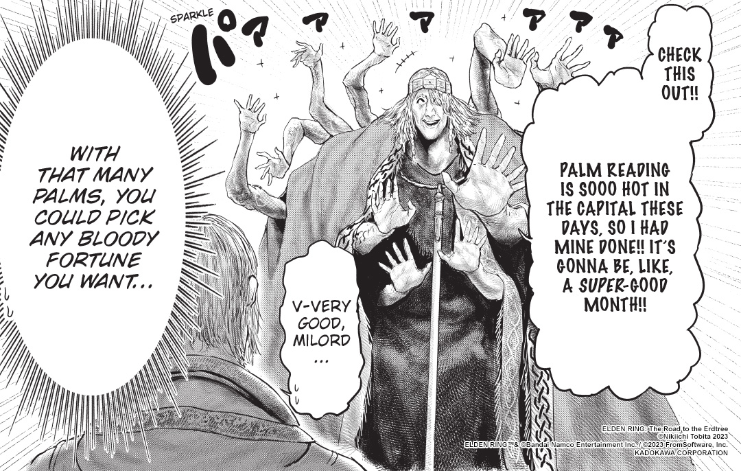 Elden Ring: The Road to the Erdtree manga feels like watching someone play the game without being too serious about it. You’ll see the Tarnished “die” a lot! You’ll wonder about the nature of characters and think, “Yeah, I would be really suspicious about asking for their help too.” You’ll question people’s decisions in-world and their attitude about things. You can feel the love for the source material while reading, and it makes the whole experience more enjoyable.