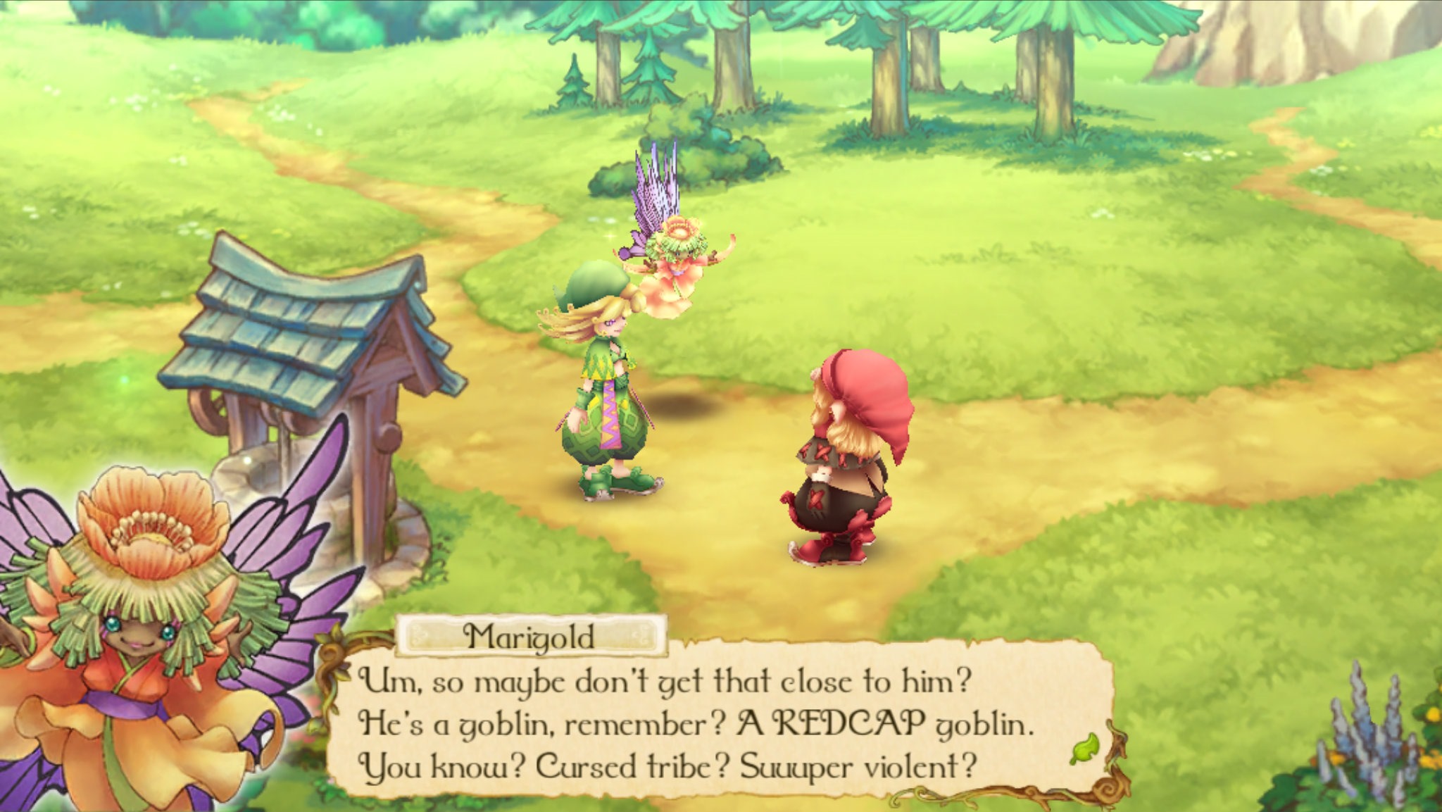 Worldbuilding and lore lead to other Mana similarities in Egglia: Legend of the Redcap commonalities. The array of fantasy races helps maintain a similar ambiance. In the Mana series, we saw people like Amazons, Beastmen, Dragons, Dwarves, Dudbears, Elves, Faeries, and Jumis, not to mention the occasional anthropomorphic cactus. Egglia: Legend of the Redcap fills its world with the same sorts of species. It seems to relish delivering these characters, offering a diverse population. Why, within your first hour you will have met an anthropomorphic plant, brownie, dwarf, elf, fairy, and goblin. That isn’t even counting the gigantic living mountain and plant who have taken up residence in your hometown. The Mana series felt alive and vibrant because of all the different races there. Even though Egglia: Legend of the Redcap involves a land that has been separated and ripped apart, having such a wide assortment of different people, with different opinions of each other, and forcing them to interact and befriend one another, makes it feel fuller.