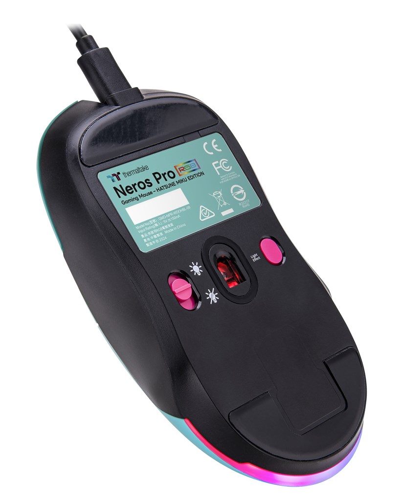 Both the mouse and mouse pad feature newly drawn art of Hatsune Miku, with the artwork being featured in the box and manual for the mouse, and on the mousepad itself. The gaming mouse costs 9,980 yen (or approximately $63.89.) Its design is inspired by Miku’s color scheme, with the main body being her iconic teal and the additional DPI and side buttons being magenta. Her 01 serial number appears on the lower part of the mouse also in magenta. The mouse also includes RGB lights that can be turned on and off.