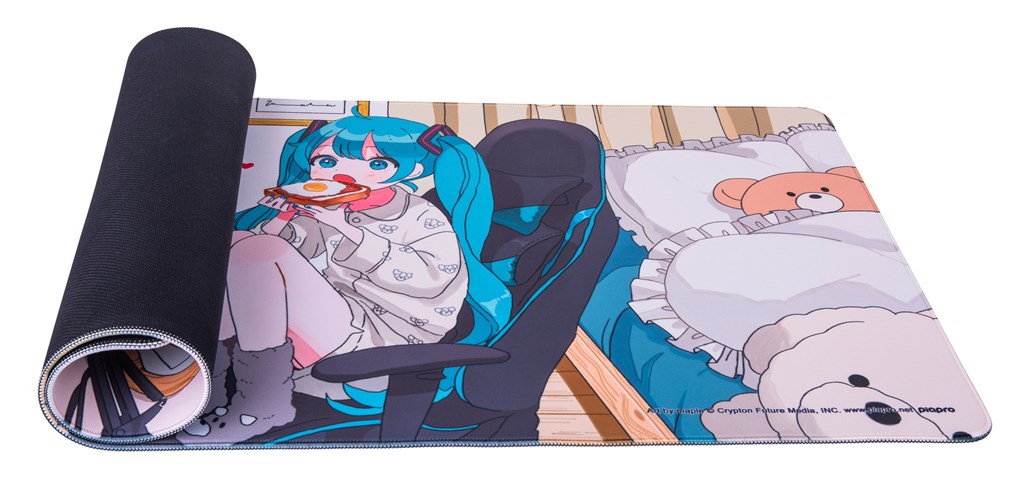 Meanwhile, the mousepad costs 5,980 yen (~$38.28.) The pad shows the full artwork, and it depicts Miku sitting on a gaming chair in a bedroom while eating breakfast. The bedroom itself is decorated in her teal color scheme, and the desk features an elaborate gaming setup with dual monitors.