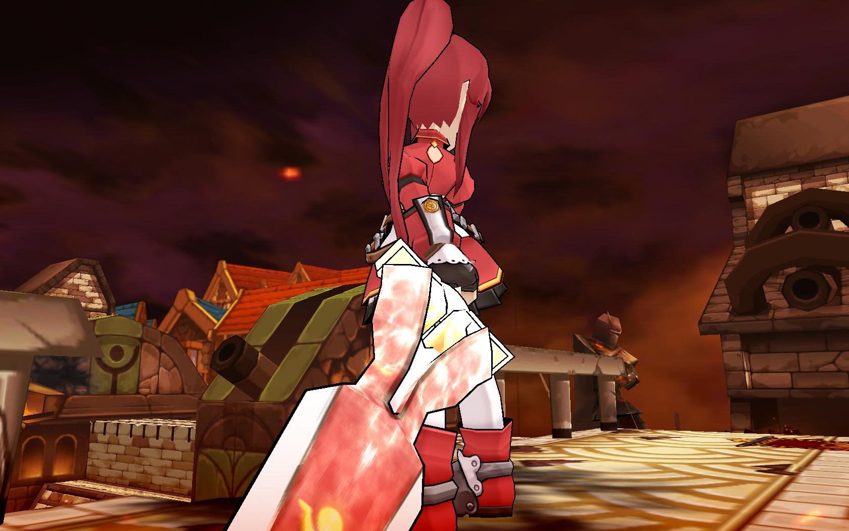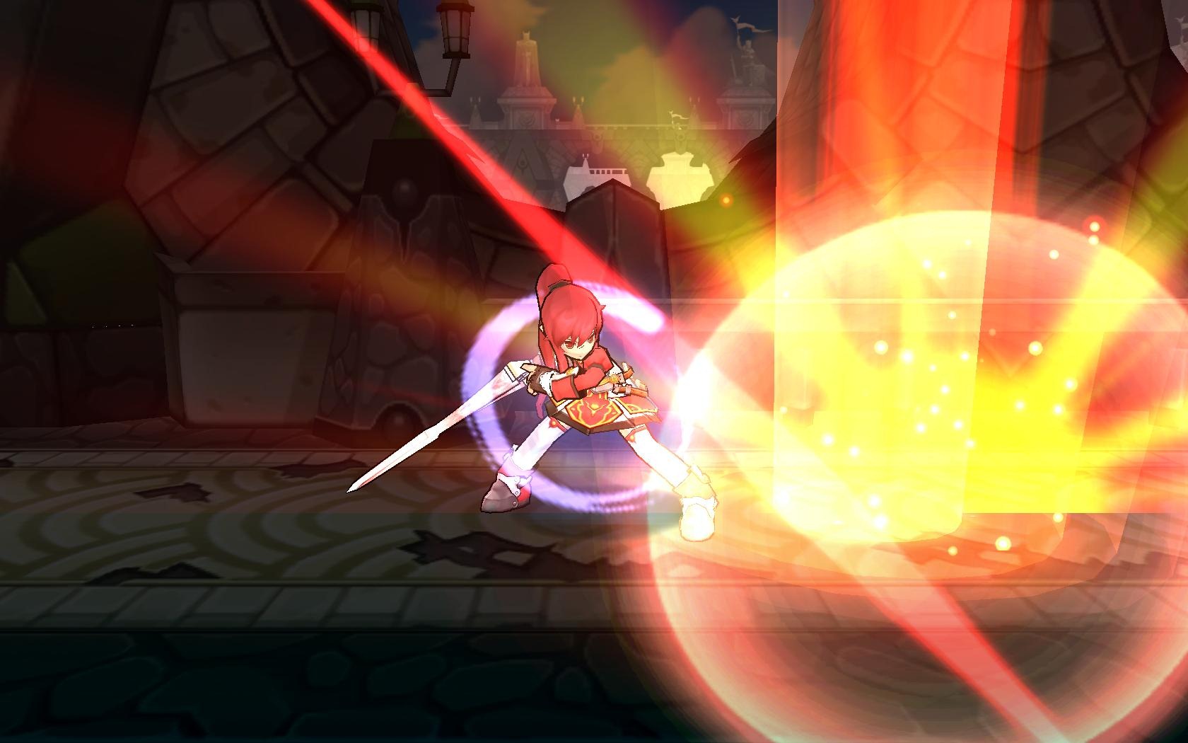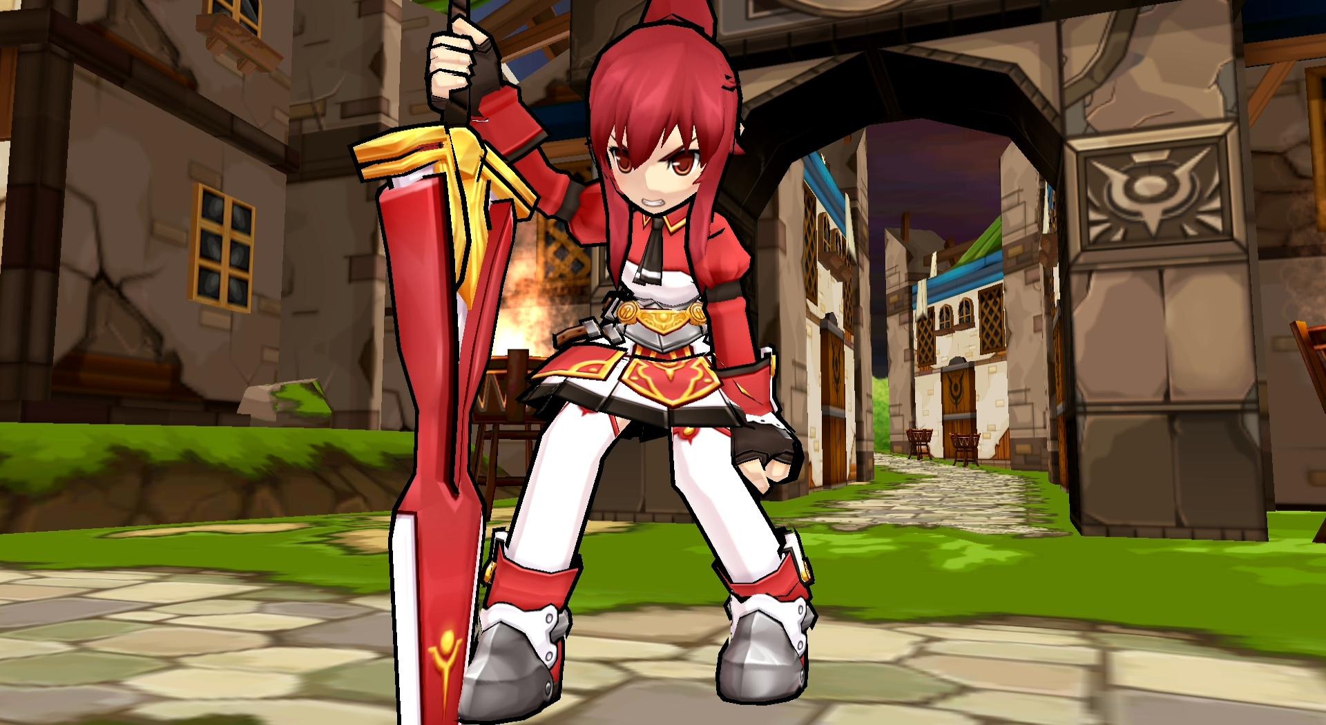 Elesis is a new playable melee character for Elsword who uses flame-based attacks and a mean two-handed claymore. Her style of combat follows the “Chivalry” system, which is an additional bar that fills up and allows for managing a new type of resource that makes her stronger when swappin’ between attacks.
