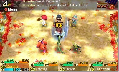 For starters, the character creation system is intact. The game starts off with you flying into the land of Aslarga as a prospective adventurer, and before you step into your first dungeon, you have the opportunity to create your character. You can choose from the fairly diverse roster of 8 classes, ranging from the familiar Landsknecht class to the Runemaster class, and 3 classes are added later (including the Mystery Dungeon tribute, the Wanderer). As far as I am aware, the exact roster of classes available in each Etrian game varies, but it appears that the classic jobs have all been included. My only nitpick is that there aren’t any character designs to choose from, so you will be playing with multiple Gunners who look the same save their color palettes. The skill tree character growth system is back as well, with each character being allotted a certain number of points you can distribute between skills as you like. In Etrian Mystery Dungeon, you can set the distribution to happen automatically as well, so you can focus on the more Mystery Dungeon aspects of the game. This can be customized to focus more on balance or on different sets of skills. For example, you can have the game put all your points into the Link attacks first for a Landsknecht, or you can have it put them into Stab skills. At this point, one may feel that this game is more Mystery Dungeon than Etrian Odyssey, and I would agree. After all, the bulk of the gameplay—the exploration through the eponymous mystery dungeons—has nothing to do with Etrian Odyssey and indeed feels nothing like it at all. With there being no strong story or characters to carry over, I had been hoping that the atmosphere of adventure and exploration would somehow pervade into this crossover game. The question was, how was that to happen when each floor in the dungeon were a randomized mix of large blocky rooms and narrow bottleneck hallways? The randomization may make me unsure what was at the end of the path, but it was more a question of “Which way will the path turn?” or “Where are the stairs?” and “Is there a trap in front of me?” than of “What will I see in the next room?” I never felt like I was discovering something new when playing Etrian Mystery Dungeon, and that was perhaps the greatest disappointment for me.