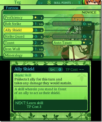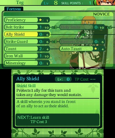You are then given several SP (skill points) to start off with, which you can use to start playing around on the character’s class skill map. The skill map is rather extensive—new skills are learned by investing one skill point, but you can also use more points to enhance the skill, either by decreasing usage cost or increasing its effect.
