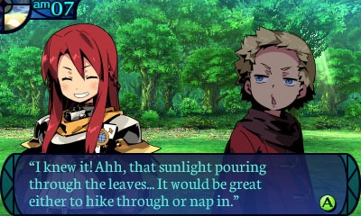 Despite all the added dialogue and new scenes, however, Etrian Odyssey Untold doesn’t slow down. Other than the rest and relaxation portions, the game is briskly paced. For example, immediately following a skippable animated sequence showing you arriving at Etria, you’re immediately taken to see the councilman and start off on your first adventure. There isn’t a lot of small talk here because “You have a task to do so go do it!” In addition, you are even given the option to skip the small talk and pub scenes if you wish. Between giving players the option to view the scenes and the excellent attention to pacing, Untold knows when to speed up and when to slow down. The game would’ve still been a drag, though, if these characters were completely horrible in battle, but thankfully this isn’t the case. In Untold’s Story Mode, you are provided with a well-balanced party. While you can’t change any classes or party members (despite the five characters forming a Guild, you can’t recruit any new characters), the standard classes are all more-or-less covered. You have a Protector for defense, a Medic for healing, an Alchemist for elemental damage, a Highlander for physical damage (and some healing), and a Gunner for long-distance physical and elemental damage. While you can’t pull off tricks like status effects or buffs or debuffs without Grimoire Stones (or until you level up and spend the Skill Points on those specific skills), you can power through the dungeon well enough on this party. This could even serves as a good introduction to other classes that can be considered more difficult to use in Classic Mode. (I do believe that the Librarians can’t learn every single skill available to their class in Story Mode.)