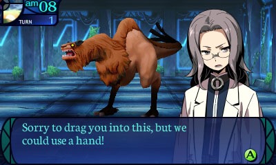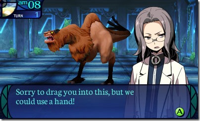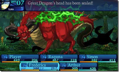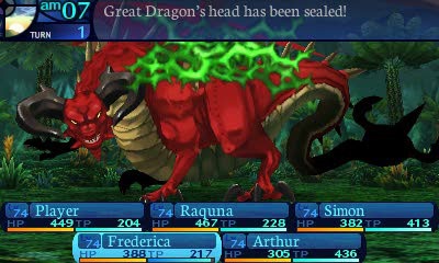 Like in prior Etrian Odyssey games, I enjoyed playing with the markers, trying to capture every single detail of the ridiculously complex floors of the dungeon. My favorite feature of the dungeon map is that, after you’ve completed the trek from one set of stairs to the next, you unlock the Floor Jump feature. This allows you to warp to that set of stairs, even if you’re on a entirely different floor. This saves lots of time when you have to return to where you left off after an emergency visit to the town’s Inn to heal up. Of course, no dungeon is complete without obstacles. These come in the form of regular enemies, extra-powerful enemies called FOEs, and traps. Regular enemies are met on a semi-random basis, where you can see how likely an enemy is going to attack in a color gauge on the top screen (Red is danger!). Traps are interactions you find in dungeons with various effects. Sometimes they’ll heal you, but usually you’re then immediately forced to fight a party of monsters immediately afterwards. Investigate at your own peril! FOEs hulk through the forests, each type of beast moving in their own specific patterns. Some will only attack if you’re in their line of sight; others will attack only if you are already in another encounter (yes, enemies can tag-team against you in battles); others will only attack if you stand in their way and won’t actively chase you; and yet others will go out of their way to hound you but have to rest after a moment. Sometimes these FOEs themselves create puzzles that you have to solve with timing and planning your steps beforehand.