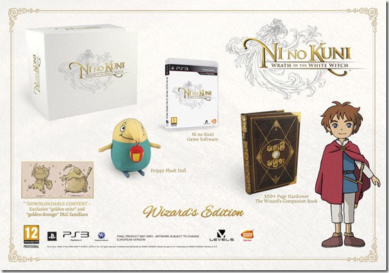 Update: Confirmed for North America, too. In Europe, Namco Bandai are releasing a “Wizard’s Edition” of Ni no Kuni collector’s edition, dubbed the “Wizard’s Edition”. This comes with the game, a Drippy plush doll, a Golden Mite and Golden Drongo DLC familiars, and most importantly, the 300+ page hardcover “The Wizard’s Companion” (Magic Master in Japan) book. Take a look at the package below:
