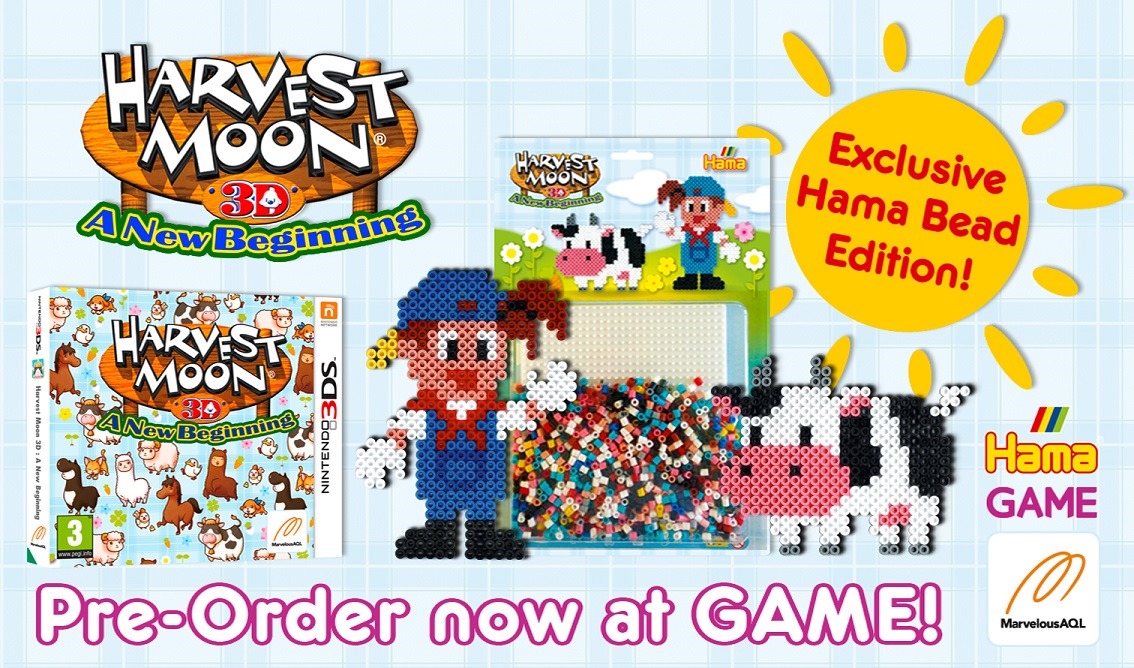 Zen United is bringing Harvest Moon 3D: A New Beginning to Europe and if you reserve the game you’ll get a pack of Harvest Moon themed Hama Beads as a bonus. The Hama Bead collector’s pack has beads to make the boy and cow from the Harvest Moon series. Natsume often gives out plushies with preorders. What does Japan get? Usually, nothing.