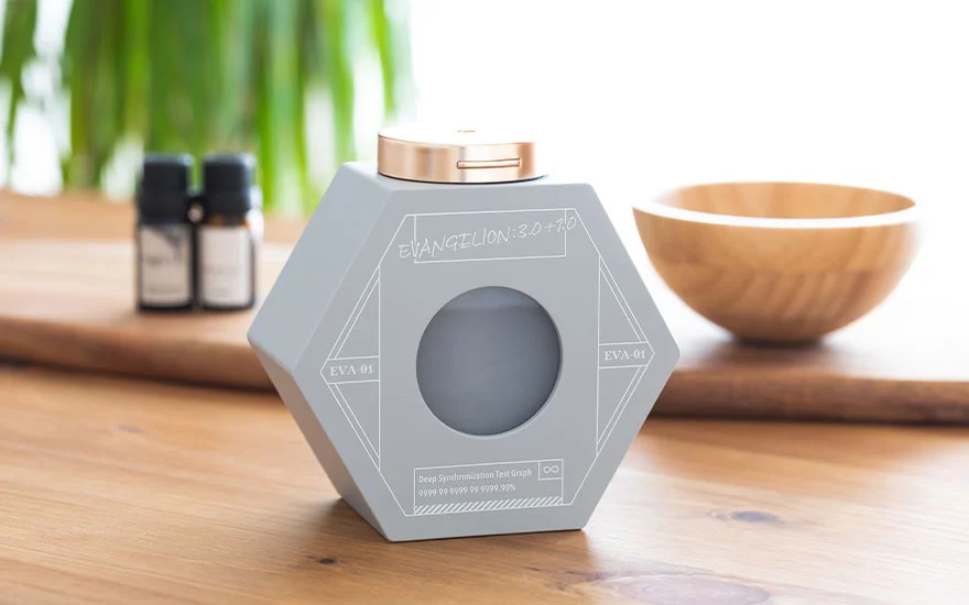 The words “GOD’S IN HIS HEAVEN. ALL’S RIGHT WITH THE WORLD” are engraved on the steel magazine rack. The humidifier has the words “Evangelion :3.0+1.0″ printed on it in a handwritten style. The flower domes are all arranged with the image colors of the respective Evangelion units the main characters pilot. They also all come with stickers that can be attached. Here’s a closer look at the Evangelion lamp, humidifier, magazine rack, and flower domes:
