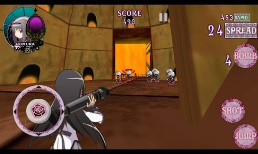 Puella Magi Madoka Magica TPS Featuring Homura Akemi puts you in control of Homura who is armed to the teeth. Players move Homura using a virtual joystick and blast enemies with different weapons. Homura can pick up powerups for spread shots, rapid fire, and ring which gives her bullets that bounce off walls. Homura can also freeze time if you tap on her Soul Gem meter (top left hand corner) when it is full.