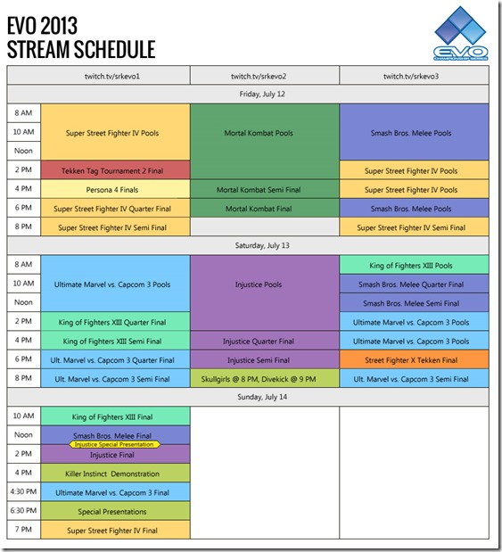 The annual EVO fighting game championship series is on this weekend, and there are three official streams to keep track of, with a schedule for the entire event available courtesy of Shoryuken.com. The three streams are embedded below, with the full EVO schedule below those. SRK Evo 1: