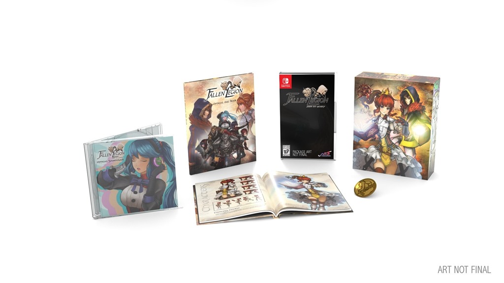 One of the reasons we wanted to work with NIS America is to create a magnificent limited edition for Fallen Legion and they delivered in spades. The Fallen Legion: Rise to Glory Exemplary Edition includes the game, a full soundtrack, hardcover art book, and a medallion with Cecille on one side and the Legate on the other.